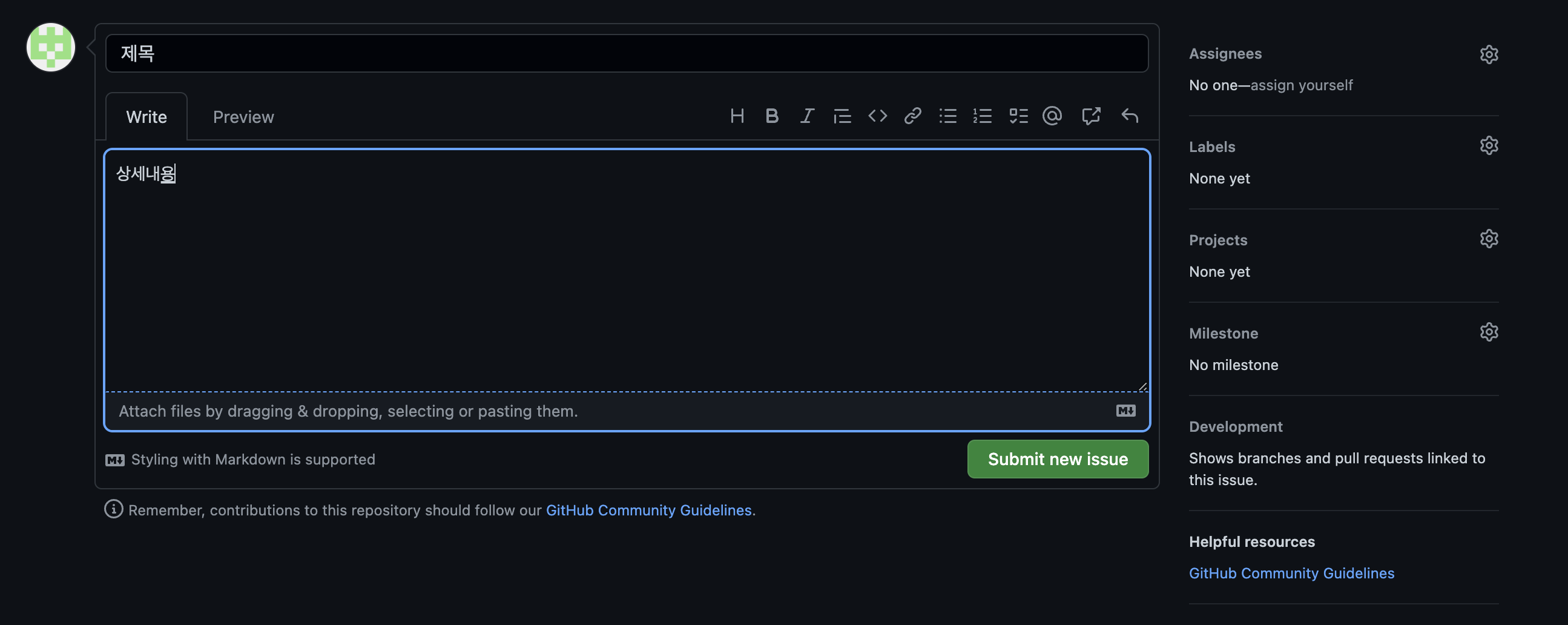 제목 욮에 있는 #숫자는 이슈 번호이다. 작업 시 이슈번호를 등록하여 사용한다.